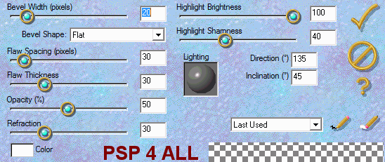 Then Tramages > Pool Shadow as above and finally Eye Candy > Gradient Glow as before. Select None. Close or delete the original layer underneath. Leaves : Activate and Selections > Select All > Selections > Float > Selections > Defloat then add a layer and fill this layer with green. Keep selected and apply Eye Candy 3 > Glass.