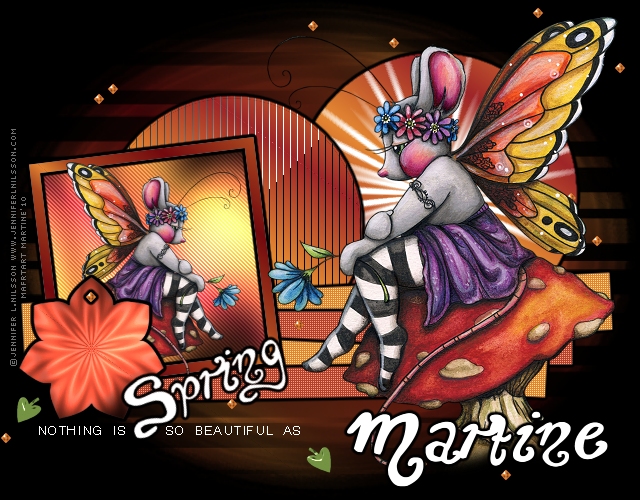 Select None. Close or delete the original layer underneath. Spring: Activate and Selections > Select All > Selections > Float > Selections > Defloat. Apply Eye Candy > Gradient Glow. Select None. Glitter: Activate and Selections > Select All > Selections > Float > Selections > Defloat then add a layer and fill this layer with the gradient above. Kep selected and apply Eye Candy 3 > Glass as on the leaves above. Select None. Close or delete the original layer underneath. Select the glitter on the flower with the Selection tool then click in the selection with the magic wand and apply Eye Candy > Gradient Glow. Désélectionner tout. STEP 4: Tubes Tube on the right: Place right at the top above all the layers. Tube on the left: Resize and add as a layer above the Square Frame layer and under the Flower layer. STEP 5: Credits & Name Credits: Choose a small font like Pixelette in size 6. Name : Unchanged thoughts or a font of your choice. Size 62 with antialias checked and colour #FFFFFF - First letter of your name in size 90. Then apply the same Eye Candy > Gradient Glow. STEP 6: Saving Save one last time with all the layers opened. Then merge visible all the layers except the black background and copy paste as a new image - that gets rid of the excess of canvas around your result. Add a black background for the Results page and then click on File > Export > JPEG Optimizer. Click on the Wizard and choose Better image quality. Martine 11 March 2010 If you have any questions, don't hesitate to contact me ![]() ![]() |