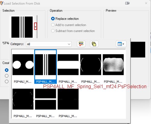 Fill with #983C49. 6. Selections > Select None. 7. Duplicate. Image > Mirror. 8. Add a layer. Click on Selections > Load/ Save selection/ Load Selection From Disk. Choose PSP4ALL_MF_Spring_Sel2_mf24.PsPSelection. 9. Fill with #983C49. 10. Add a layer and fill with #F9E1E5. 11. Open Nikita's 1250181869_nikita_masques. 12. Layers > New Mask layer > From an image and select 1250181869_nikita_masques. 13. OK. Layers > Merge group. 14. Selections > Select None. 15. Add a layer. Click on Selections > Load/ Save selection/ Load Selection From Disk. Choose PSP4ALL_MF_Spring_Sel3_mf24.PsPSelection. 16. Fill with #983C49. 17. Selections > Select None. 18. Renamer Border. 19.Add a layer. Click on Selections > Load/ Save selection/ Load Selection From Disk. Choose PSP4ALL_MF_Spring_Sel4_mf24.PsPSelection. 20. Fill with #983C49. 21. Rename Cercle. 22. Add another layer and fill with #F9E1E5. 23. Open masque FL-Fmask010. 24. Layers > New Mask layer > From an image and select FL-Fmask010. 25. OK. Layers > Merge group. 26. Layers > Arrange > Move Down. 27. Apply Xero > Fritillary