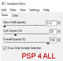Click on your work. STEP 2 - Template and Tube Vertical 1 - Selections > Select All. Select > Float > Select > Defloat. Add a layer > Fill with #EAE665. Apply Eye Candy 4000 > Gradient Glow.