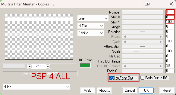 33. Remplir avec #d84928. 34. Ne rien sélectionner. 35. Dupliquer. 36. Sélections > Flottante > Statique. 37. Remplir avec #0D6604. 38. Ne rien sélectionner. 39. Réglage > Flou Gaussien avec un radius sur 20. 40. Calques > Réorganiser > Déplacer vers le bas. 41. Dupliquer. 42. Calques > Fusionner calques visibles. ETAPE 2 - Les décos, le WA, les éléments et le tube Décos - 43. Sélections > Charger/ Enregistrer une sélection > Charger la sélection à partir du disque 44. Choisir PSP4ALL_MF_StPat_Sel3_mf25.PsPSelection. 45. Sélections > Transformer la sélection en calque. 46. Remplir avec #d84928. 47.Sélectionner le tréfle, cliquer sur Suppr et remplir avec #0D6604. 48. Dupliquer. 49. Image > Miroir horizontal. 50. Calques > Fusionner avec le calque de dessous. 51. Dupliquer. 52. Image > Miroir vertical. 53. Sélections > Ne rien sélectionner. 54. Sélections > Charger/ Enregistrer une sélection > Charger la sélection à partir du disque 55. Choisir PSP4ALL_MF_StPat_Sel4_mf25.PsPSelection. 56. Sélections > Transformer la sélection en calque. 57. Remplir avec #0D6604. 58. Sélections > Ne rien sélectionner. 59. Appliquer Mura's Meister > Copies > Line