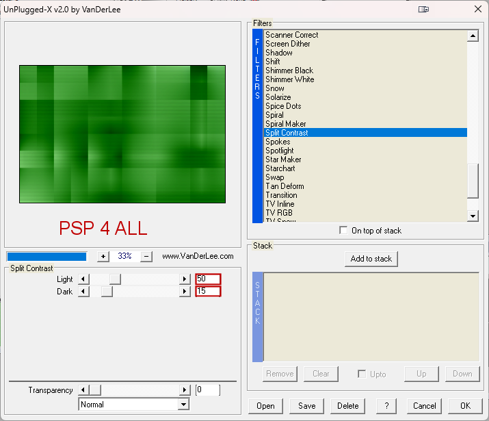 21. Objets > Aligner verticalement - centre. 22. Dupliquer. 23. Image > Rotation libre > 90° gauche. 24. Calques > Fusionner visible les 3 calques. 25. Sélections > Charger/ Enregistrer une sélection > Charger la sélection à partir du disque 26. Choisir PSP4ALL_MF_StPat_Sel2_mf25.PsPSelection. 27. Sélections > Promote sélection to layer. 28. Dupliquer. 29. Sur la copie, appliquer Mura's Meister > Perspective Tiling