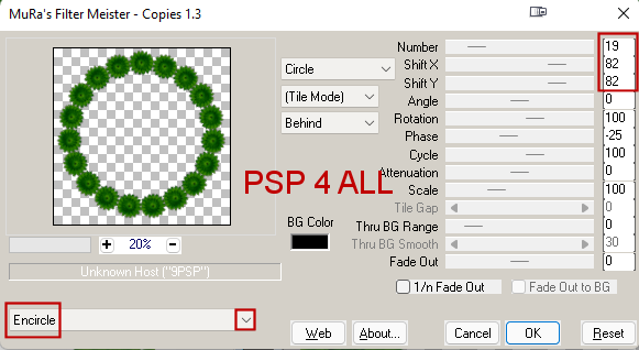 ETAPE 1 - Elémentts J'ai utlisé cette ombre portée : Eye Candy 5 > Impact > Perspective Shadow - Settings : Drop Shadow, Low. Ouvrir une image 800x800. Remplir avec #000000. On redimensionnera plus tard. CC_Lucky_E31. A gauche, en haut. Dupliquer. Image > Miroir horizontal. CC_Lucky_E32. A gauche, en haut. Dupliquer. Image > Miroir horizontal. CC_Lucky_E19. 25%. A gauche, en haut. Ajouter l'élément CC_Lucky_E30. Redimensionner 20%. Objets > Aligner > Horizontalement - centre. Appliquer MuRa's Filter Meister > Copies