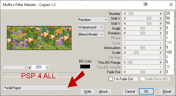 ![]() STEP 1 Open an image 851x315. Copy paste the tube as a new layer. Mura's Meister > Copies. Click on Reset then in the scrolling menu, choose Wall Paper, default setting.