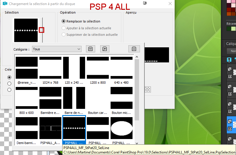 With the Pen Tool, trace 3 lines in white: Create On Vector and Anti-alias, both checked; width = 3.00; Line Style = Diamond. Draw them at the top. See my tag. Convert to raster layer. Duplicate and Image > Mirror > Mirror Vertical. Element 056ef (Irish Luck) - 7%. Bottom, on the left. Duplicate. Image > Mirror Horizontal. Add a layer. Selections > Load/Save Selection > Load Selection From disk. Choose PSP4ALL_MF_StPat20_SelLine