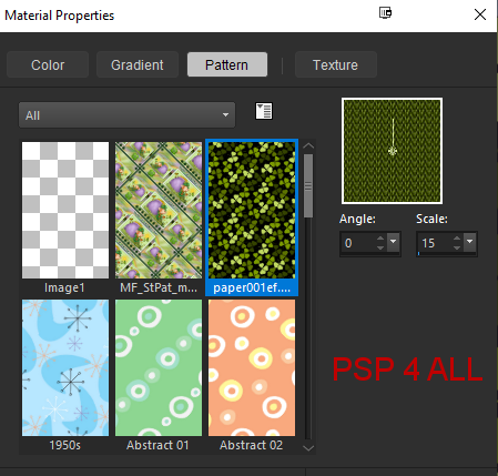 Click on OK. Selections > Promote selection to layer. Fill with paper papier001ef(Irish Luck), scale at 15%.