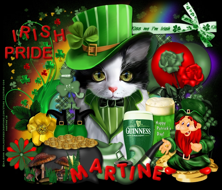 Si nécessaire, sur les petits éléments, régler la netteté. Réglage > Davantage de Netteté. pb-ip-rainbow4 - A gauche. pb-ip-rainbow3 - Mettre à droite. pb-ip-frame2 - Au milieu. pb-ip-frame1 - A gauche. pb-ip-ribbon-wrap - 53%. En haut et à droite. J'ai enlevé un tout petit bout en haut. pb-ip-balloon - A droite. J'ai coloré le ballon du milieu avec le rouge du Leprechaun. Teinte=255 et Saturation=228. J'ai ajouté mon tube au milieu. pb-ip-rose - Image > Miroir. Mettre à droite. pb-ip-rose - Recolorer la rose du haut avec le même rouge : Teinte=255 et Saturation=228. pb-ip-drink1 - 50%. pb-ip-drink3 - 55%. pb-ip-shoe - 50%. Au milieu et vers le bas. pb-ip-pot-of-gold2 - 55%, et à gauche du sabot. pb-ip-shamrock-leprechaun - 45%. En haut sur le chaudron. pb-ip-clover-coins - Image > Miroir. A droite. pb-ip-Leprechaun - 55%. A droite. pb-ip-flower2 - 35%. En bas, à gauche. J'ai ajouté 3 trèfles que j'ai d'abord coloré en rouge en haut et à gauche. J'ai pris un des trèfles du pb-ip-frame1. pb-ip-mushroom - 45%. En bas et à gauche. pb-ip-irish-pride-wa - J'ai coloré en rouge comme avant. ETAPE 2 : Texte et Crédits Texte de votre choix ou votre nom - avec la police Porky's. Et en rouge #C00000. Appliquer un Biseautage intérieur : Effets > Effets 3D > Biseautage Intérieur