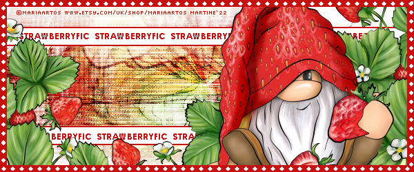 Fill with red (#C71111). Selections > Modify > Contract 2 pixels and fill with white. Selections > Select None. Add the text of your choice. Or mine: STRAWBERRYFIC, using Century Gothic, in rouge, bold. Objecs > Align > Horizontal Center. Duplicate and move down to place on the bottom white strip. Add your tube on the right and the elements you want to use on the left and in the middle, those in the material file or others of your choice. I have used my tube . I duplicated it and placed it on the left. Duplicated it again and apply a rotation 90° and placed it in the middle. STEP 3 - Border and Credits Border: Ajouter un calque. Selections > Modify and contract 10 pixels. RFill with red (#C71111). Selections > Delete. Selections > Select None. Add a layer. With the rectangle tool, in white, line style on Diamonds with 6 in width, draw a rectangle in the middle of the border. See my tag. Credits: with a small font like Pixelette or any other small font. Martine 21 July 2022 If you have any questions, don't hesitate to contact me |