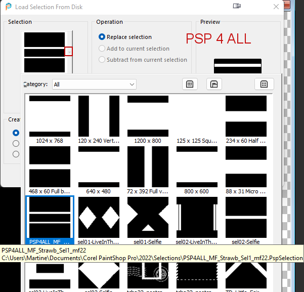Blend Mode of this layer > Overlay. Layers > Merge Down. STEP 2 - Mask, elements and Tube Layers - Add a layer > Fill with #FFFFFF (white). Layers > New Mask Layer > From Image and choose NarahsMasks_0896. Click on OK. Layers > Merge Group. Add a layer. Selections > Load/Save Selection > Load Selection From disk. Choose PSP4ALL_MF_Strawb_Sel1_mf22.PspSelection