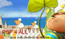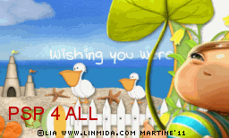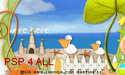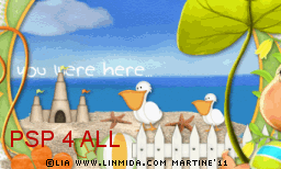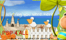 Name this layer Text7. Close it. STEP 6: Animation FeClose all layers above the 7 layers of the text animation. Close the white background at the bottom. Merge visible all the other layers. Name this merged layer Ani1. Close this layer. Open all the layers above the seven layers of the text animation. Merge visible and name Ani2. STEP 7: Animation in Animation Shop Still in PSP, make sure that all layers axcept these 2 layers Ani1 and Ani2 are closed. Merge visible these two open layers: Ani1 and Ani2. Copy paste in Animation Shop. Back in PSP. Clck on Undo. Open Text1. There are now 3 layers which are open: Ani1 and Texte1 and Ani2. Merge visible these three open layers and copy paste in Animation Shop. There are now 2 frames in your new animation in AS. Back in PSP. Clck on Undo. Close Text1 and open Text2. Merge visible the three open layers: Ani1 and Texte2 and Ani2 . Copy paste in Animation Shop after the active frame. There are now 3 frames in your animation. Back in PSP. And repeat the same steps for each layer of the text animation. There should be 8 frames in your animation in AS. Edit > Select All. Right click on the first frame > Frame Properties and enter 55 for the speed. Click again on the first frame, the frame without the text Wishing you were here... and enter 250. Click on View and check the animation and see if the overall speed suits you. If it does not, change it. Click on Animation > Animation Properties > Canvas color - choose opaque and white. The background stays white when you do it this way. File > Save As. Martine 14 June 2011 |