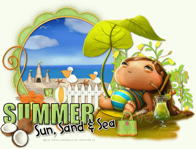 Use this same drop shadow on all the elements. Elements to add within the frame: Add the castle - Castle 23 at 20%. Ball - element 19 at 20%. Bucket and spade - element 46 at 10%. Starfish - element 45 at 30%. Mine are on 2 layers so I could place them where I wanted. Pelican - element 42. One at 20% and the other at 15%. Elements outside the frame: Fence - element 49 at 70%, on the right. Element 47. One at 50% and the other at 55%, below the fence layer. Element 54, butterfly, at 30% on the right. Add your tube on the right. Bag - element 31, at 25%. Coconut - element 11 at 40% on the left. Do not forget to add a drop shadow on your elements and tube. STEP 3: Text Summer: in capital letters, with Impact or a font of your choice, in size 62. Black for the foreground and Stroke colour and green #AFD36F taken from the frame for the background and fill. Apply a 3D Effects > Inner Bevel