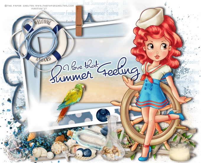 Appliquer le masque Mask20 -20. Calques > Nouveau calque de masque > A partir d'une image. OK. Ajouter un calque et remplir de blanc. Faire glisser ce calque sous le masque. Revenir sur le calque masque/texte. ETAPE 2 : Les éléments PDS_N- print - Mettre à gauche. Dupliquer et mettre la copie à droite vers le bas. Sand - Ajouter un calque puis choisir le tube Jasc Sable. Coloriser si nécessaire. Mettre en bas, à droite. PDS_N- leaves2 - 25%. En bas et à droite. Dupliquer et mettre cette copie un peu plus vers le milieu. PDS_N- glitter - 75%. En bas à gauche. Dupliquer et mettre la copie à droite. PDS_N- driftwood2 - En bas. PDS_N- driftwood1 - 5. A droite, en bas. PDS_N- string5 - En bas. PDS_N- flower3 - 25%. A gauche. PDS_N- flower2 - 25%. Au dessus. PDS_N- flower1 - 25%. Au dessus. PDS_N- rocks - 65%. A gauche. PDS_N- frame4 - Milieu à gauche. PDS_N- frame5 - 75%. Au dessus. Cliquer à l'intérieur avec la baguette magique. Sélections > Modifier > Agrandir de 5 pixels. Ajouter un calque et remplir la sélection avec le papier PDS_N- paper8. Sélections > Ne rien sélectionner. Faire glisser le papier sous le calque PDS_N- frame5. PDS_N- frame2 - 85%. Au-dessus du calque PDS_N- frame5. Texte I love that Summer Feeling - voir plus bas sous Texte et Crédits. PDS_N- tape - A droite. Dupliquer. Image > Miroir. PDS_N- bead1 - 25%. Au milieu. PDS_N- starburst - A droite, en haut dans le coin des cadres. Dupliquer et mettre en bas, à gauche, dans le coin. PDS_N- parrot - 30%. Sur le cadre, à gauche. PDS_N- shell2 - 15%. En bas, à gauche. PDS_N- shell3 - 15%. En bas, à gauche. PDS_N- shell1 - 25%. En bas. PDS_N- starfish - 15%. En bas. PDS_N- bottle3 - 35%. En bas. PDS_N- bottle2 - 40%. En bas, au milieu. PDS_N- lamp - 35%. En bas, à droite. PDS_N- welcomeaboard - 40%. En haut, à gauche. PDS_N- string3 - 40%. Au dessus. Ajouter votre tube à droite. ETAPE 3 : Texte et Crédits Texte : de votre choix ou le mien I love that Summer Feeling avec la police Dominique en bleu #1A2A63. Appliquer Eye Candy > Gradient Glow