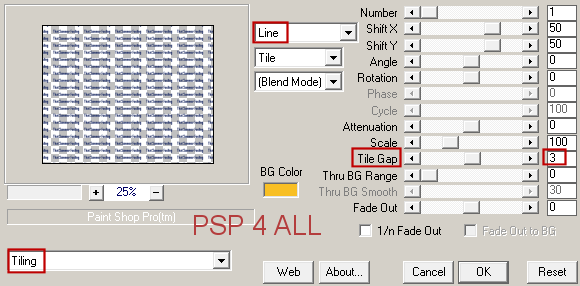 ETAPE 1 : Le masque Ouvrir le masque Mask 20-20. Puis ouvrir une image, transparente, 680x550. Cliquer sur l'outil Texte - Noir #000000, police Agency FB, Vectoriel, en petite taille. Taper le texte That Summer Feeling ou celui de votre choix. Puis cliquer sur Objets et choisir Aligner > Centrer sur le support. Enfin cliquer sur Calques > Convertir en calque raster. Appliquer MuRa's Meister > Copies. Preset Menu en bas à gauche - choisir Tiling et à droite configurer comme ci-dessous.