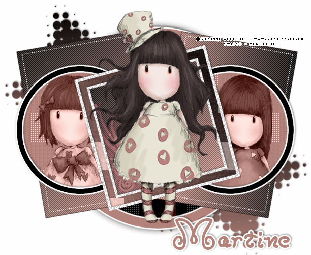 ETAPE 7 : Circles 2 & 3 Circle 2 : Sélections > Sélectionner Tout > Sélections > Flottante > Sélections > Statique > Ajouter un calque et remplir de noir. Sélections > Modifier > Contracter par 10 pixels et appuyer sur Suppr. Appliquer Eye Candy Gradient Glow comme dans l'Etape 3. Ajouter la même ombre portée. Click on Circle 2 : Cliquer avec la baguette magique à l'intérieur et Sélections > Modifier > Agrandir par 6 pixels > Ajouter un calque et remplir avec votre couleur tube ou #B3837B. Cliquer sur Effet et appliquer l'effet penta.com > color dot comme dans l'Etape 4. Garder la sélection et ajouter votre tube : la tête, redimensionnée si nécessaire. Sur la palette calque, mettre l'opacité sur Luminance. Déplacer ces deux derniers calques pour les mettre sous la bordure du Circle 2. Circle 3 : Refaire la même chose que pour Cercle 2. Vous pouvez utiliser le même tube ou un autre au choix. ETAPE 8 : Frame Background Sélections > Sélectionner Tout > Sélections > Flottante > Sélections > Statique > Ajouter un calque et remplir avec le dégradé - mettre l'angle à 45°. Puis appliquer le filtre color.dot avec la distance à 2. ETAPE 9 : Frame Background 2 Sélections > Sélectionner Tout > Sélections > Flottante > Sélections > Statique > Ajouter un calque et remplir avec le dégradé - mettre l'angle à 318°. Et cliquer sur Effets et penta.com > jeans comme dans l'Etape 5. ETAPE 10 : Heartbrush 2 Sélections > Sélectionner Tout > Sélections > Flottante > Sélections > Statique > Ajouter un calque et remplir de votre couleur tube ou #B3837B. Ajouter la même ombre portée. ETAPE 11 : Le tube Ajouter votre tube, redimensionné si nécessaire. Puis appliquer la même ombre portée. ETAPE 12 : Crédits & Nom Crédits : Choisir une petite police comme Pixelette en taille 6. Nom : Police Moxy Roxie avec un effet Eye Candy 4000 > Gradient Glow - voir plus haut et une ombre portée. ETAPE 13 : Animation Se mettre sur le calque Frame 1 et en faire 2 autres copies : Frames 1a et Frames 1b. Se mettre sur le calque Frame 2 et en faire 2 autres copies : Frames 2a et Frames 2b. Se placer sur le calque Frame 1 et cliquer sur Effets > dsb flux > Bright Noise