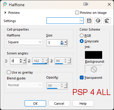 STEP 3 - Borders and Credits 38. Borders - Go to the top of the pile. 39. Edit > Copy special > Copy Merged. The image is saved in your clipboard. 40. Image > Ajouter des bordures. 41. Colour = #FFF7EF and size in pixels = 5. Check Symetric 42. Image > Ajouter des bordures. 43. Colour = #A34207 and size in pixels = 5. Check Symetric. 44. Image > Ajouter des bordures. 45. Colour = #FFFFFF and size in pixels = 40. Check Symetric. 46. Select this last border and paste the image saved to the clipboard into Selection. 47. Apply a Gaussian Blur with radius 25. 48. Apply Effects > Artistic Effects > Halftone.