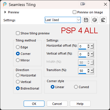 STEP 1 - Background 1.Open an image 900x550. Fill with white. 2. Add a layer. Selections > Select All. 3. Edit > Paste the tube into the selection. 4. Selection > Select None. 5. Apply Effects > Image Effects > Seamless Tiling