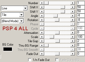 Texte: Cliquer sur l'outil Texte, Noir, Vectoriel, taille 10 et police Visitor TT2 BRK. Puis cliquer sur Objets et choisir Aligner > Centrer sur le support. Puis cliquer sur Calques > Convertir en calque raster. Appliquer Mura Meister > Copies. Preset Menu en bas à gauche - choisir Tiling. Utiliser les configurations par défaut sauf pour Shift X et Shift Y, y mettre 50 et Tile Gap, remplacer le 0 par 2.