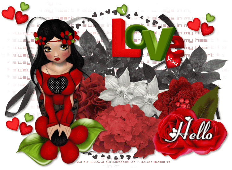 Credits using the Pixelette font or any other pixel font. STEP 3: Wordart Open the wordart. Place the Love word at the top, on the right. Place the hearts at the top, in the corner on the right. Name them Coeurs1. Duplicate twice. Place a copy on the left, at the top and in the corner = Coeurs2. And the other copy at the bottom, on the left and in the corner = Coeurs3. Duplicate Hearts1, Hearts2 and Hearts3. Activate the Hearts1 layer. Image > Resize 95%. Activate the Hearts2 layer. Image > Resize 95%. Activate the Hearts3 layer. Image > Resize 95%. Close these 3 layers. STEP 4: Animation Close the white background layer. Merge visible all the other layers: elements, tube, text and credits, Love wordart and the 3 layers with hearts - Hearts1, Hearts2 and Hearts3. File > Save As = AniHearts1. Click on the Undo arrow. Close the 3 layers Hearts1, Hearts2 and Hearts3. Ouvrir les 3 copies de Hearts1, Hearts2 et Hearts3. Merge visible and Save As = AniHearts2. Animation Shop Click on File > Animation Wizard. A window opens: Same size as the first image frame > Next. Opaque and choose white #FFFFFF > Next. Centered in the frame and With the canvas color > Next. Yes, repeat the animation indefinitely and enter 40 for Dispaly time > Next. 5th window and time to add your 2 images. Click on Add Image and navigate to go and fetch AniHearts1. Click again on Add Iamge and again navigate to go and fetch AniHearts2 > Next. Last window. Click on Finish. View the animation. If everything is OK, then click on File > Optimisation Wizard. Martine 28 January 2015 If you have any questions, don't hesitate to contact me |