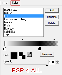 frame03 - 75% element34 - Rotate 90° left. element26 - Towards the left. See my result. Duplicate. Image > Mirror.Place on the right, move a bit lower down. element16 - 65%. On the left. element20 - 40%. Duplicate. In the middle. element06 - 50% - On the right. element21 - 60%. On the left. element10 - 65%. On the right. Add your tube on the left. STEP 2: Text and Credits Text of your choice or your name, using the Fiolex Girls font. Apply Eye Candy > Gradient Glow: