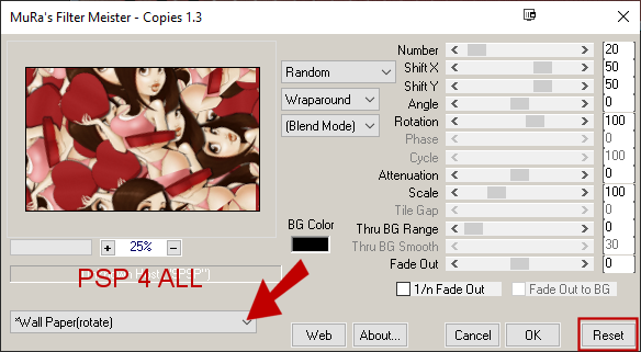 ![]() STEP 1 Open an image 851x315. Copy paste the tube as a new layer. Effects > Plugins > Mura's Meister. Click on Reset then, in the scrolling menu, choose Wall Paper(rotate), default setting.