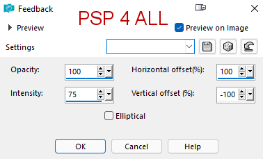 Layers > Merge > Merge Group. Add a layer. Click on Selections > Load/Save Selection > Load Selection from Disk. Choose PSP4ALL_MF_Val_Sel2_mf22. PspSelection. Fill with the red colour #C32F33. Selections > Modify > Contract 1 pixel. Edition > Cut. Fill with white. Selections > Modify > Contract 4 pixels. Edition > Cut. Add a layer and fill with the blue colour #2575BB. Drop the Opacity to 25. Selections > Select None. Layers > Merge down. Add the wordart as a new layer. Resize it to 70%. Layers > Merge down. Apply Feedback. Effects > Reflection Effects > Feedback
