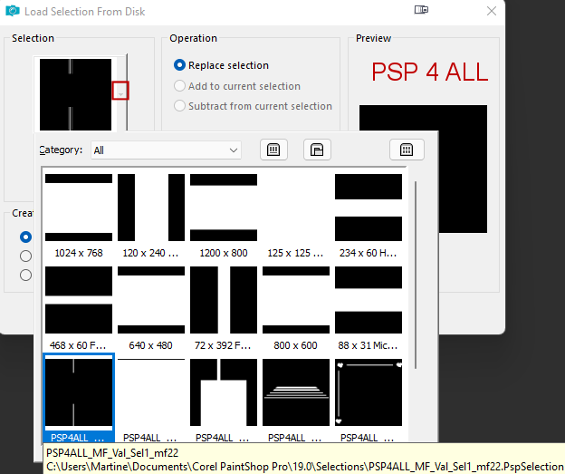 Add a layer. Selections > Load/Save Selection > Load Selection From disk. Choose PSP4ALL_MF_Val_Sel1_mf22. PspSelection