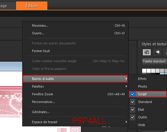 23. Touche M pour désélectionner l'outil sélecteur ETAPE 3 - Bordures 24. Ne pas fusionner si vous utilisez ce script. 25. Pour faire les bordures on va se servir de mon script : PSP4ALL_Val_mf26. 26. Vérifier que vous avez bien le filtre nécessaire : Italian Editors Effect - Picture in Picture. 27. Prendre une copie du fichier PSP4ALL_Val_mf26 dans le matériel. 28. Maintenant mettre ce script dans le dossier Scripts Sécurisés de votre PSP. 29. Pour trouver ce dossier, regarder dans Fichier > Emplacement des fichiers et puis Scripts Sécurisés. 30. Noter l'emplacement du dossier et y naviguer pour y mettre le script PSP4ALL_Val_mf26. 31. Dans votre espace de travail, vérifier que la barre Script est là. 32. Si elle n'y est pas, clic droit sur la barre d'outils en haut, et sélectionner Barres d'outils > Script
