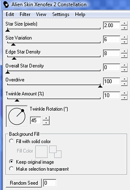 Open the other layer and merge visible these two layers and Copy and paste into Animation Shop as a new animation. Go back to PSP, click on Undo and activate the Flowers layer. Apply the Constellation filter again but click once on the Random seed button. Merge visible Copy and Paste After Current Frame. Return to PSP, click on the Undo Arrow and activate the Flowers layer. Apply the Constellation filter again but click once on the Random seed button. Merge visible Copy and Paste After Current Frame in Animation Shop. You now have a total of 3 frames. Save your animation and use. That's it!