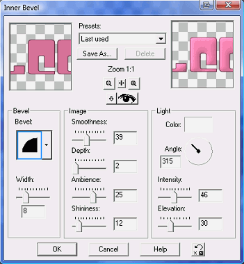 1. With your magic wand click inside the first frame and go to Selections > Modify > Expand by 12 - add a layer and fill with one of the papers. I also resized these. Move this layer under the Frames layer. Select inside the frame with the magic wand and again expand by 12. Copy paste one of your tubes as a new layer and resize it so it looks nice inside the frame. Selections > Invert > Hit Delete on your keyboard and move the tube layer under the frame. Make sure the background layer and the mask layer are closed and merge visible the Frame layer, the paper layer and the tube layer. 2. Now repeat what you did in 1 with the frame in the middle. 3. Let's fill frame 3 on the right and repeat what you did in 1. Now add your text: I typed Welcome in Capital letters using Gyporady - Vector - Bold - Size: 42 and two colours: a lighter shade of pink #D77399 for the fill - #713D53 for the stroke. Convert to raster layer. Apply an effect: Effects > 3D Effects > Inner Bevel: