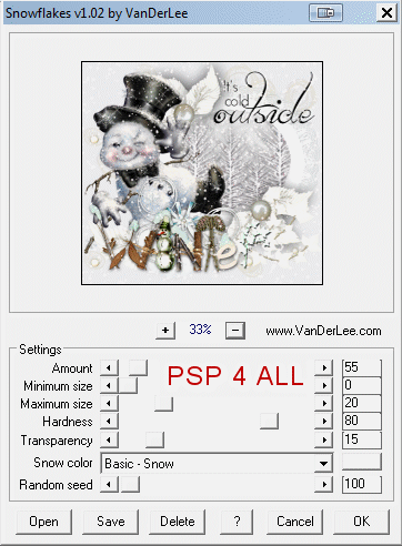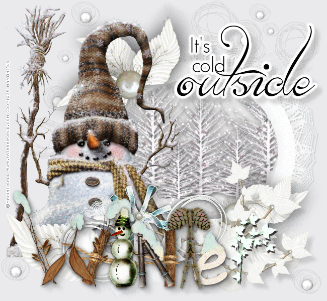 and click on OK. Merge visible and copy paste this merged image in Animation Shop. Frame 2: Back in PSP. Click 3 times on the Undo arrow and apply the Snowflakes effect a second time. Keep the same settings except set the Random seed at 200. Click on OK. Merge visible and copy paste this merged image after the active frame in Animation Shop. Frame 3: Back in PSP. And repeat but this time set the Random Seed at 300. Paste in AS. Frame 4: And a 4th time with the Random Seed at 400 this time. Paste in AS. You now have 4 frames in your animation. Edit > Select All. Animation > Frame properties > Display Time and enter 20. Click on View Animation to check that you are happy with the speed. If you are happy, click on File and save. Martine 16 January 2012 If you have any questions, don't hesitate to contact me ![]() ![]() |