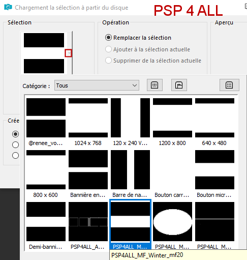 Ajouter le tube à droite. Appliquer une ombre portée - 4, 4, 70, 7. ETAPE 4 Edition > Copie spéciale > Copier avec fusion. Cliquer sur Sélections > Charger/ enregistrer une sélection > Charger la sélection à partir du disque. Sélectionner PSP4ALL_MF_Winter_mf20.