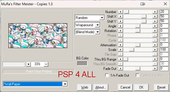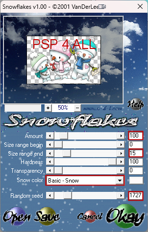 Okay. Selections > Select None. Edit > Copy Special > Copy Merged. Open Animation Shop. Paste As New Animation. Back to PSP - Undo twice to remove the snow and be back to the rectangular selection. Apply VDL Adrenaline but change Random Seed to 2650. Okay. Selections > Select None. Edit > Copy Special > Copy Merged. In Animation Shop, Edit > Paste After Current Frame. Back to PSP. And Repeat. But you must change Random Seed each time. 1. 1727 2. 2650 3. 3250 4. 4380 5. 6000 6. 7850 7. 8990 8. 9970 You now have 8 images in Animation Shop. Click on View Animation for a last check and save as a gif. Martine 11 January 2023 If you have any questions, don't hesitate to contact me ![]() ![]() |
