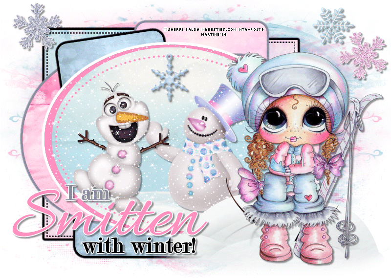 Background - white. Add a layer and fill with pink #FF90C0 or the colour of yopur choice. Open the mask Moonbeams and Spiderwebs Mask 21 and apply. Masks > New > From image - OK. Then Masks > Delete. In PSP 8 and above, it's under Layers > New Mask Layer > From Image. OK then Delete. Add a layer. Fill with blue #83C2D7 or coloujr of your choice. Apply the same mask then Image > Mirror. Layer 1 - Selections > Select All. Selections > Float. Selections > Defloat. Copy paste paper 002 in the selection. Add a layer and fill the selection with a gradien blue-pink, angle at 57° and Repeats 0. Change the layer properties and set on Hard Light. Selections > Select None. Apply Eye Candy > Gradient Glow. Color = Fat but change white for black #000000. Basic = Enter 5.00 for the Glow Width. Layer 2 - Leave as it is. Layer 3 - Selections > Select All. Selections > Float. Selections > Defloat. Copy paste paper 002 in the selection. Add a layer and fill the selection with a gradien blue-pink, angle at 57° and Repeats 0. Change the layer properties and set on Hard Light. Selections > Select None. Apply Eye Candy > Gradient Glow. Fat and Black, as before. Layer 4 - Leave as it is. Layer 5 - Selections > Select All. Selections > Float. Selections > Defloat. Copy paste paper 001 in the selection. Add a layer and fill the selection with pink #FF90C0. Change the layer properties to Overlay to change the colour of the paper, to match it to one of the colours of the tube. Selections > Select None. Apply Eye Candy > Gradient Glow. Fat but change the colour to blue/ grey #8B8E9F. Layer 6 - Selections > Select All. Selections > Float. Selections > Defloat. Copy paste paper 001 in the selection. Add a layer and fill the selection with blue #C7E2F5. Change the layer properties to Couleur to change the colour of the paper, to match it to one of the colours of the tube. Selections > Select None. Apply Eye Candy > Gradient Glow. Fat and black #000000. Layer 7 - Selections > Select All. Selections > Float. Selections > Defloat. Copy paste paper 003 in the selection. Add a layer and fill the selection with pink #FF90C0. Change the layer properties tor Couleur. pour changer la couleur du papier pour assortir à une des couleurs du tube. Selections > Select None. Apply Eye Candy > Gradient Glow. Fat and colour blue/ grey #8B8E9F.. Layer 8 - As for Layer 6. Layers will not be visible on my tag as they are behind the tube but if you use a different tube... Layer 9 - As for Layer 7. Layer 10 - As for Layers 8 and 6. Layer 11 - Fill with pink #FF90C0 and apply Eye Candy > Gradient Glow white #FFFFFF. Layer 12 - Selections > Select All. Selections > Float. Selections > Defloat. Copy paste paper 004 in the selection. Add a layer and fill the selection with blue #C7E2F5. Set this layer on Screen and opacity at 75% to soften the colours. Layer 13 - Selections > Select All. Selections > Float. Selections > Defloat. Copy paste paper 003 in the selection. Add a layer and fill the selection with pink #FF90C0. Selections > Select None. STEP 2: Word Art and Credits Word Art: Colour the text, I used pink for Smitten and blue/ grey for I am. Merge vivisle these 2 layers and move left towards the bottom. Credits: with the Pixelette font or any other small pixel font. STEP 3: Elements and tube MC_OS_WinterFun_E08 - 75%. On the right, above Layer 13. Image > Mirrorr. MC_OS_WinterFun_E07 - 70%. On the left. Image > Mirror. MC_OS_WinterFun_E30 - 50%. On the right. MC_OS_WinterFun_E21 - 45%. Top right. MC_OS_WinterFun_E20 - 45%. On the right. MC_OS_WinterFun_E19 - 45%. On the left. MC_OS_WinterFun_E05 - 50%. On the left, on the text I am. MC_OS_WinterFun_E03 - 45%. In the middle, at the top. MC_OS_WinterFun_E20 - 45%. On the right. Add your tube on the right. MC_OS_WinterFun_E28 - 40%. next to your tube, on the left. STEP 4: Animation Highlight Layer 12. Selections > Select All. Selections > Float. Selections > Defloat. Open the Snow File. Edit > Copy frame 1. Back to your working canvas and click on layer 12. Copy Frame 1. Rename Snow 1. Back to the Snow file and click on frame 2. Edit > Copy frame 2. Back to your working canvas and paste Frame 2, above 1. Rename Snow 2. Repeat these steps until you have pasted and renamed all 10 layers from your Snow file. ------------------- Now back on your working canvas, highkight Snow 1, the click on Selections > Invert and Delete. Move onto Snow 2 and click on Delete. Then Snow 3 and click on Delete. Repaet for all the Snow layers. Selections > Select None. ------------------- Close all Snow layers 1 to 10. Open Snow 1 and merge visible with all the other layers. Copy paste in Animation Shop Back to PSP. Click on Undo and close Snow 1. Open Snow 2. Merge visible. Copy paste this image in AS after Current Frame. Retour dans PSP. Cliquer sur Annuler la dernière commande et fermer Neige2. Ouvrir Neige3. Fusionner visible. Coy paste this image in AS after Current Frame. And repeat until you have merged all 10 Snow layers2 and you have 10 frames in Animation Shop. Animation Shop: The file is heavy so you can remove some of the frames. Edit > Select All. Animation > Cull. In the window, remove 1 frame every 3 frames. You will be left with 7 frames.