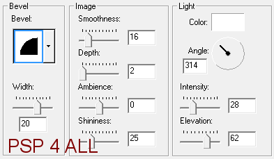 Berries - On the right. Rotate right 90°. Same drop shadow but change the opacity. Set back to 30. Branch - On the right. Same drop shadow. Rose - On the right. Same drop shadow. Bird - On the right. Same drop shadow. Snowball - On the left. Same drop shadow. Snowball - at 75%. Same drop shadow. Bow3 - Colorize. Hue at 146 and Saturation at 142. Rotate right 10°. Same drop shadow. Deco1 - 85%. Same drop shadow. STEP 2 : Text and Credits Texte - Snow with the Impact font in blue. Opacity at 56. Apply an Eye Candy 4000 > Gradient Glow.