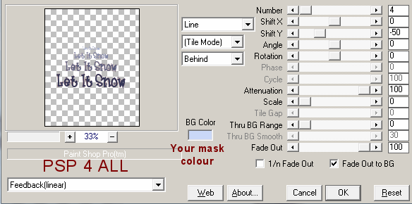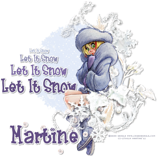 Mêm ombre portée que précédemment. STEP 4 - Crédits Avec une petite police Pixel comme Pixelette. STEP 5 - Animation Ouvrir l'animation Snow dans PSP. Fermer les 10 calques. Go back to your result and close the background layer. Revenir sur votre résultat. Cliquer sur le calque Masque. Copier coller ce calque sur l'image Snow et mettre ce calque tout enbas, en dessous de tous les calques Snow. Retour sur votre résultat. Fermer le calque Fond et fermer le calque du masque. Fusionner visible tous les autres calques : élément, tube, texte et credits. Copier coller ce calque tout en haut de l'image Snow, au dessus du masque et de tous les calques Snow. S'assurer que tous les calques Snow sont fermés. Ouvrir le calque masque, le premier calque de l'animation Snow : Frame 1 et le calque fusionné tout en haut, celui avec le tube. Cliquer sur le calque masque. Sélections > Sélectionner tout > Sélections > Flottante > Sélections > Statique. Sélections > Inverser. Se mettre sur le calque Frame 1 et cliquer sur Suppr pour supprimer la neige en dehors du masque. Sélections > Désélectionner tout. Fusionner visible les 3 calques : celui du masque, celui du Frame 1 et celui tout en haut avec le tube. Copier coller cette image dans Animation Shop. Retour à PSP. Cliquer deux fois sur la flèche Annuler et fermer le calque Frame 1. Ouvrir le calque Frame 2. S'assurer bien être sur Frame 2 et cliquer sur la touche Suppr du clavier. Fusionner visible les 3 calques : celui du masque, celui du Frame 2 et celui tout en haut avec le tube. Copier coller cette image après l'image active dans Animation Shop. Retour à PSP. Cliquer deux fois sur la flèche Annuler et fermer le calque Frame 2. Ouvrir le calque Frame 3. Répéter ce qui a été fait pour le calque Frame 1 et Frame 2 et à chaque fois coller les images fusionnées dans Animation Shop. Il y a 10 calques Snow (Frame 1 à Frame 10). Dans Animation Shop, la nouvelle animation doit avoir 10 images. Click on Edition > Tout sélectionner. Animation > Propriétés de l'Animation > Couleur du support > Opaque et choisir blanc. Maintenant enregistrer en gif. Martine 6 janvier 2012 Si vous avez des questions, n'hésitez pas à me contacter. |