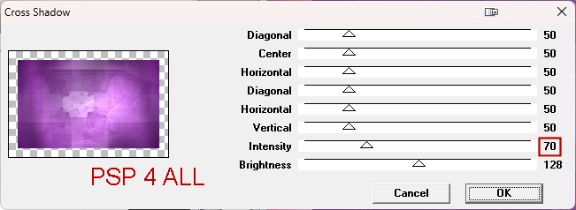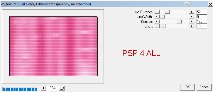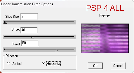 27. Blend Mode on Lighten. 28. Merge Down. 29. Selections > Select None. 30. Selections > Load/ Save selection > Load Selection From Alpha Channel. Sélectionner PSP 4 ALL_MF_BYTF_Sel # 2. 31. Click on Load. 32. Add a layer and fill with #59156B. 33. Selections > Select None. 34. Apply Distortion Filters > Scanline Shifter
