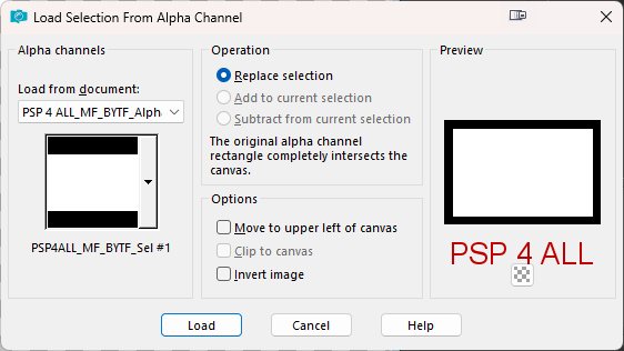 STEP 2 - Middle background 13. Selections > Load/ Save selection > Load Selection From Alpha Channel. Select PSP 4 ALL_MF_BYTF_Sel # 1. 14. Click on Load.