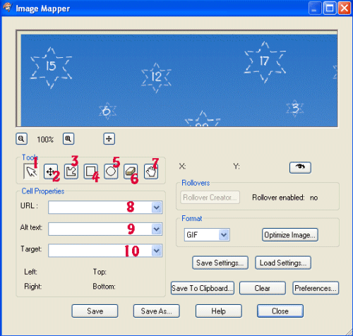 When you`re done with all numbers choose the format to save your image and check the optimize settings. Save as , save to the folder where you have the zip contents. PSP will save an image file and a html file.