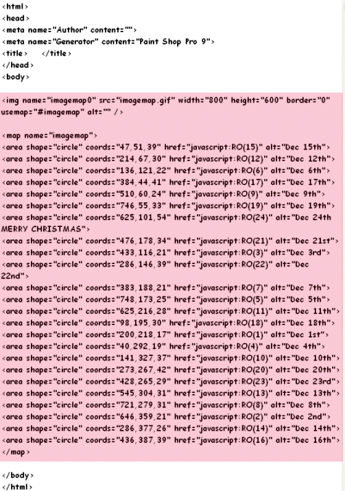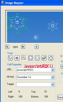 You have your first area mapped. Continue with all numbers and change the URL for each assigning the doors of your calendar: javascript:RO(number of each door)